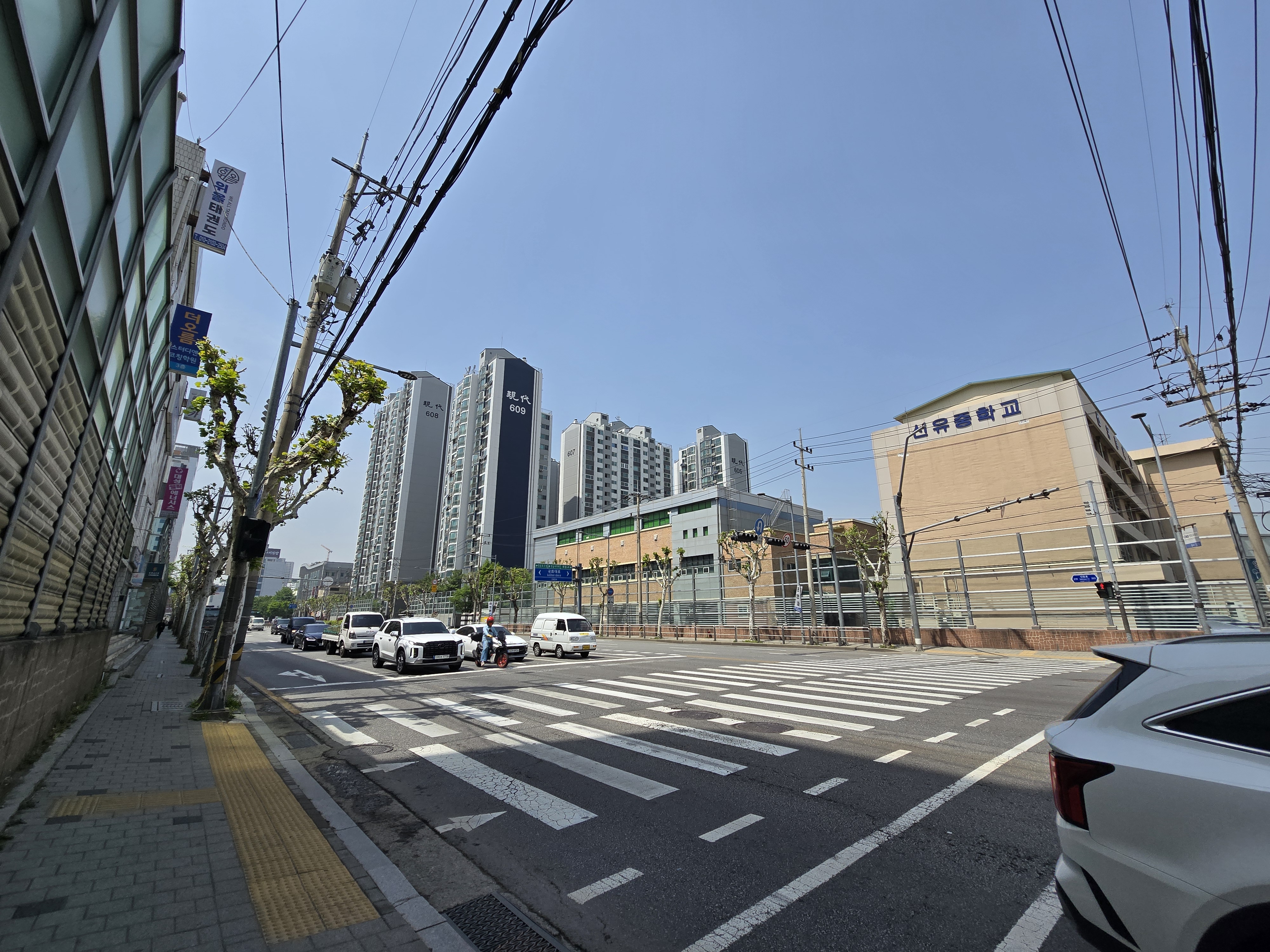 양평동 현대 6차. 선유초중고 다 붙어있음. 2차선 좁은 도로.