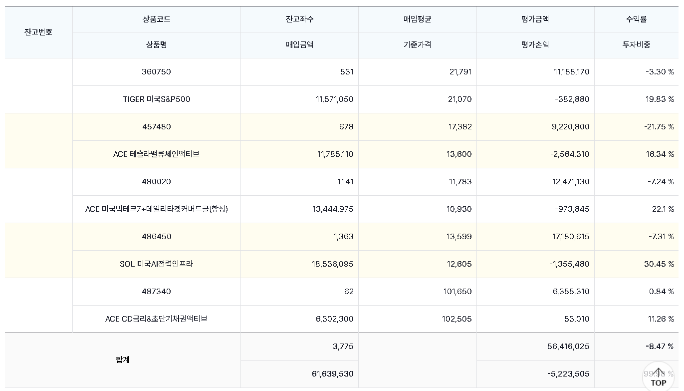 * ACE 빅테크커버드는 지난주 -4.65%. 이번 주 -7.24%.