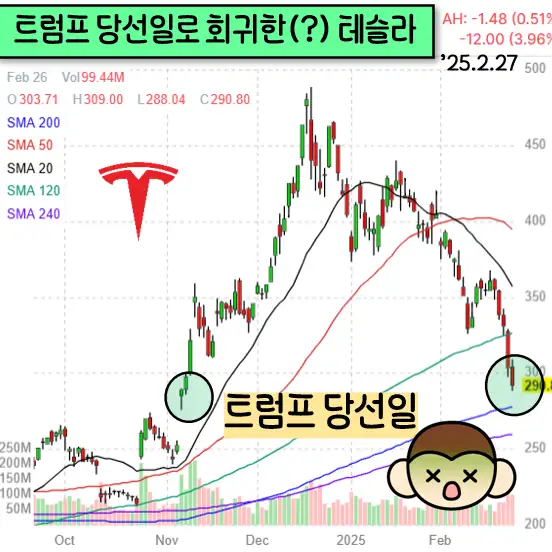 * 소수몽키님의 게시물을 보면 오늘 주가는 $277. 11월 트럼프 당선일($290) 보다 더 하락했습니다.