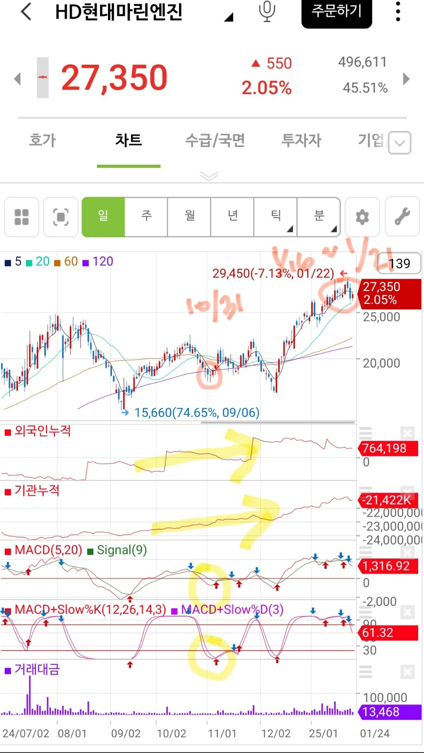 조선주는 올해 내내 주가가 상승할 산업군이라 생각하기에 보조지표가 다시 바닥이 되면